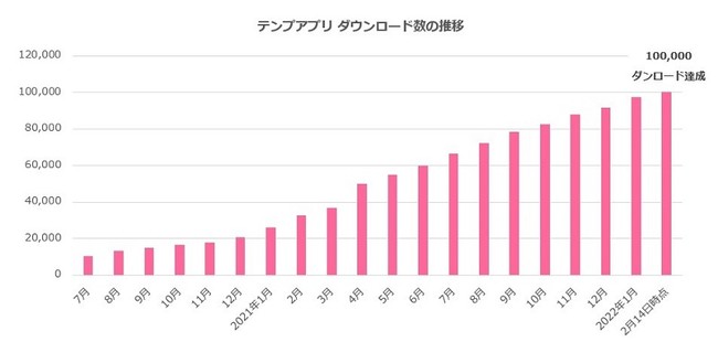 2020年7月1日にサービスを開始した『テンプアプリ』ですが、同12月にはバージョンアップを実施し、その旨のニュースリリースも出させていただきました。その際に「10万人利用を目指す」と記載いたしましたが、当初の予測よりも早く10万ダウンロードを突破することになりました。
