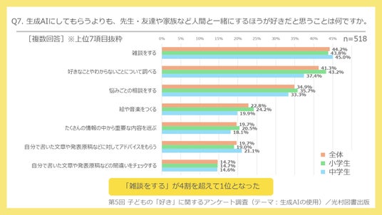 Q7. お子さまが、生成AIにしてもらうよりも、先生・友達や家族など人間と一緒にするほうが好きだと思うことをすべて選んでください。(複数回答) ※上位7項目抜粋