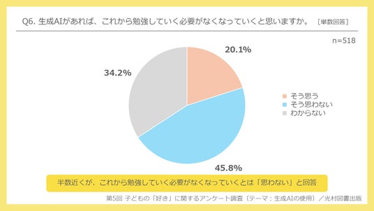 「そう思わない」という回答が45.8%となった。「そう思う」(20.1%)の2倍以上の割合となり、生成AIがあっても勉強は必要だと考える子どもが多い結果となった。