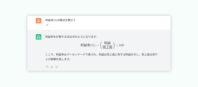 株式会社ナレッジセンスは、セキュアな環境でChatGPTを社内利用できる、法人向け生成AIシステム「ChatPro(チャットプロ)」を提供しております。この度チャットプロでは、AIとの会話に含まれる数式を綺麗に表示できる機能に対応したことをお知らせ致します。社内利用でChatGPTを活用する際の大きな事例として、ファイルのアップロードがあります。チャットGPTに社内ファイルやデータをアップロードすると、数式や計算式などが含まれます。この度のアップデートにより、そのような数式データについても問題なく会話の中で表示できるようになりました。チャットGPTの社内利用サービス「ChatPro」の詳細はこちらをご覧ください。