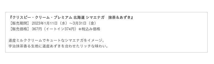 クリスピー・クリーム・ドーナツ・ジャパン株式会社(本社:東京都渋谷区、代表取締役社長:若月 貴子、以下:KKDJ)は、札幌ポールタウン店、札幌ル・トロワ店、千歳アウトレットモール・レラ店、サッポロファクトリー店※1の4店舗にて、2023年1月11日(水)より期間限定で『クリスピー・クリーム・プレミアム 北海道 シマエナガ 抹茶&あずき』を販売します。