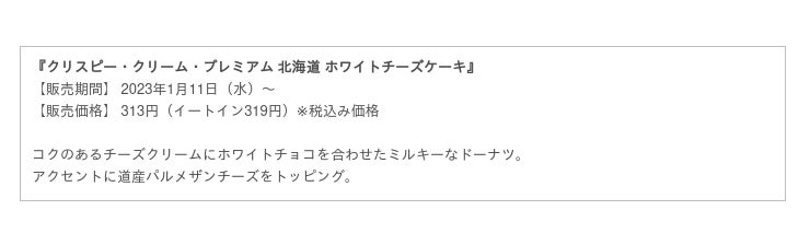 また、チーズのコクとホワイトチョコのミルキーな甘さを一緒に楽しめる『クリスピー・クリーム・プレミアム 北海道 ホワイトチーズケーキ』も同日より販売します。トッピングには北海道産パルメザンチーズを使用し、風味にアクセントを加えています。
