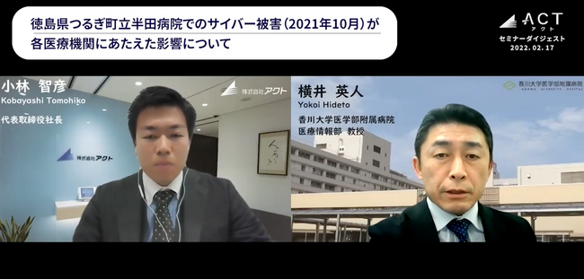 今回のウェビナーでは香川大学医学部附属病院 医療情報部 横井教授をゲストに迎え、医療現場特有の問題や、日本医療のサイバーセキュリティ課題について当社代表の小林と対談させていただきました。