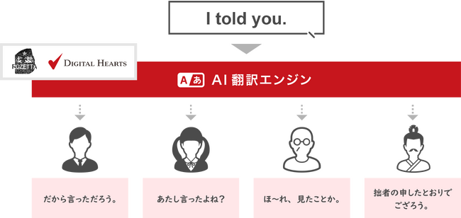デジタルハーツが長年のゲーム翻訳において培ってきた翻訳ノウハウと、ロゼッタ社のAI翻訳及びデジタルクローン生成技術を融合することで実現するAI翻訳エンジンは、従来の機械翻訳が苦手とするシナリオやセリフの翻訳にその強みを発揮します。それぞれのキャラクターが持つ特異な個性や口調を正確に理解し、キャラクターの性格や感情が乗った翻訳テキストを生成することで、各ゲームが有する独自の世界観への没入感を高めることを可能にする、ゲーム・エンターテインメントの翻訳業界に革命を起こす画期的な翻訳エンジンです。