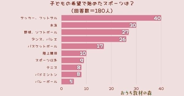 ARINA株式会社が運営する幼児、小学生の親御さん向けの教育メディア「おうち教材の森」(https://naki-blog.com/study/)は、日本全国の中学生以下のお子さんをお持ちの親御さんを対象に「子どもの希望で始めたスポーツは?」とアンケート調査を実施しました。その結果を公表します。