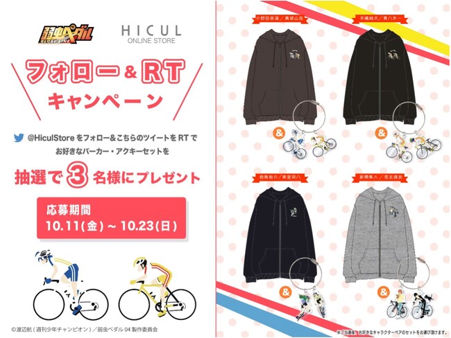 また、10月11日(金)~10月23日(日)の期間中にはプレゼントキャンペーンを実施。HICULのTwitter(@HiculStore)をフォロー&該当投稿をリツイートしてくれた人の中から抽選で3名様にお好きな『パーカー・アクキーセット』をプレゼント! たくさんのご応募お待ちしております。