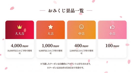 期間中は毎日おみくじを引くことができ、大大吉が出た方には最大4,000円OFFのクーポンをプレゼントします。