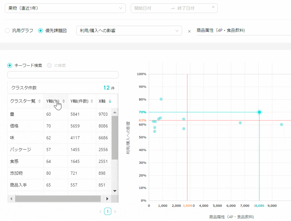 【優先課題図】クラスタ一覧を表としてX/Y軸の値を表示、クラスタの並び替えが可能に