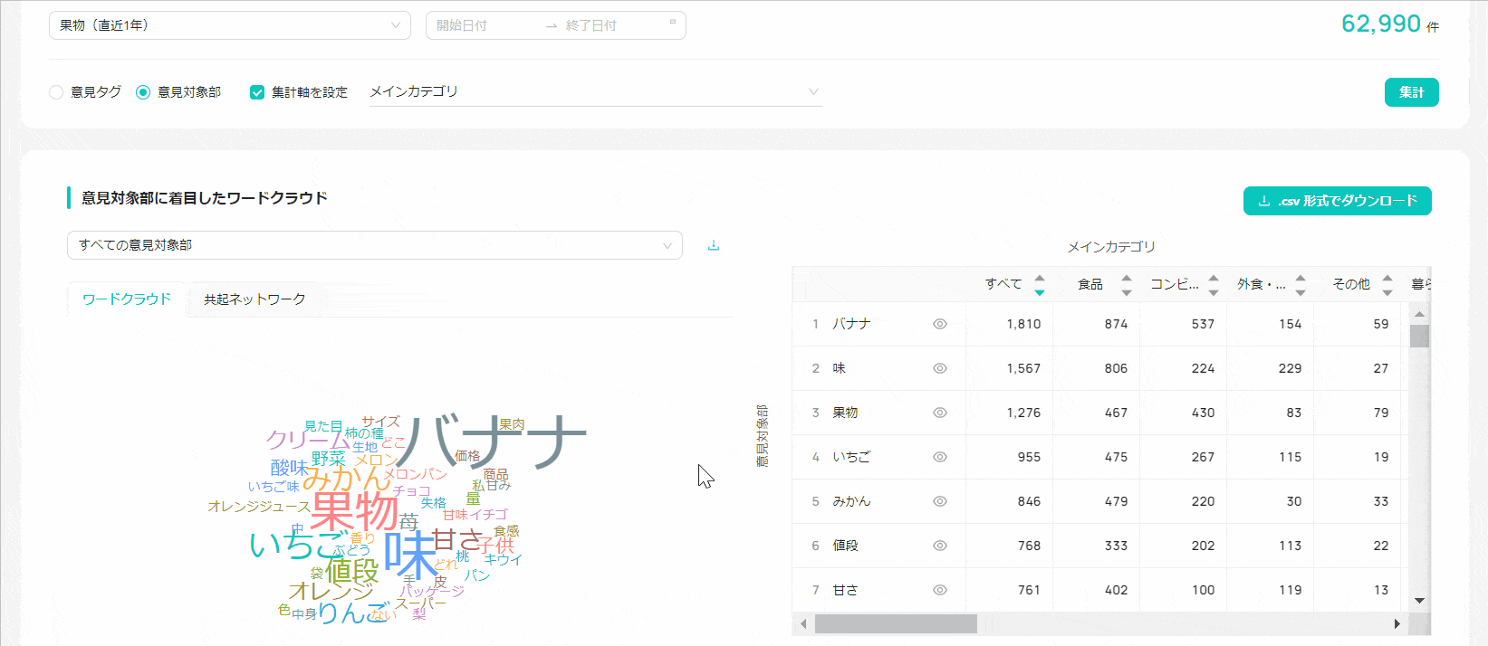 テキスト解析画面では、主に出現ワードのランキングや「主部-格-述部」が連なる意見タグのランキングを集計していました。