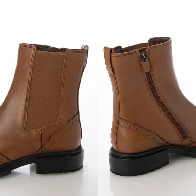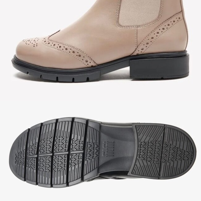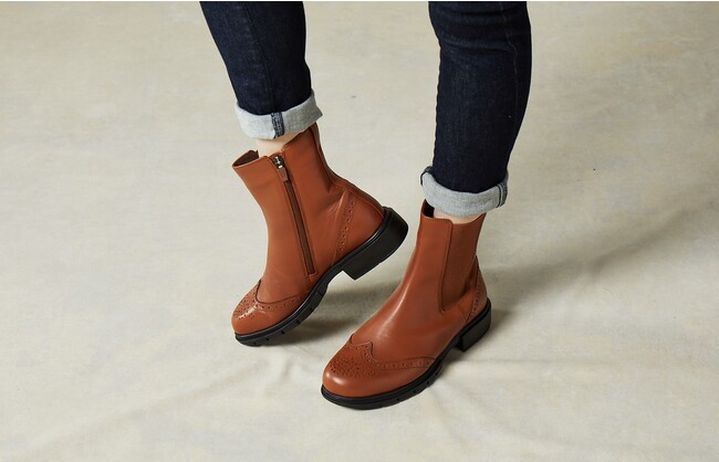 本商品のポイントは、ソールに凹凸がついたボリューム感のある「タンクソール」と、クラシックなメダリオン柄。いずれも2022年のトレンドデザインです。また、スタイルアップを意識し、足がほっそり見えるような筒のシルエットにしていますが、サイドゴアに加えてジッパーを斜めに配すことで、ほっそりした筒まわりであっても着脱しやすい仕様になっています。