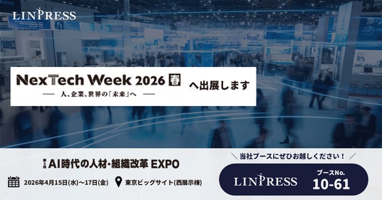 企業向けDX人材育成研修を提供する株式会社リンプレス(本社:東京都港区、代表取締役社長:三宮壮、以下、リンプレス)は、2026年4月15日(水)~17日(金)に東京ビッグサイトで開催される日本最大級のテクノロジー展 NexTech Week 2026【春】内の「AI時代の人材・組織改革EXPO」(旧称:デジタル人材育成支援EXPO)へ出展いたします。