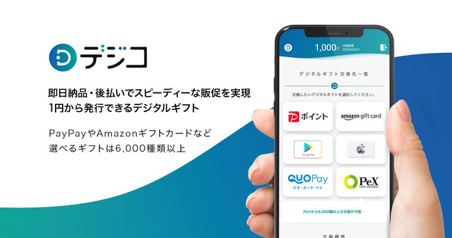 「デジコ」( https://digi-co.net/ )は、初期費用・月額費用無料で、PayPayポイントやAmazonギフトカード、Apple Gift Card、Google Play ギフトコード、QUOカードPay、PeXポイントギフトなどに交換可能なデジタルギフトを、1円単位1枚から当日発行することができるサービスです。いつでもすぐに必要な分だけ発行することができるため、企業の広告予算の調整や急なキャンペーンの実施などにも柔軟に対応することができ、当日まで人数把握が難しいイベントの謝礼などにも幅広く活用することが可能です。