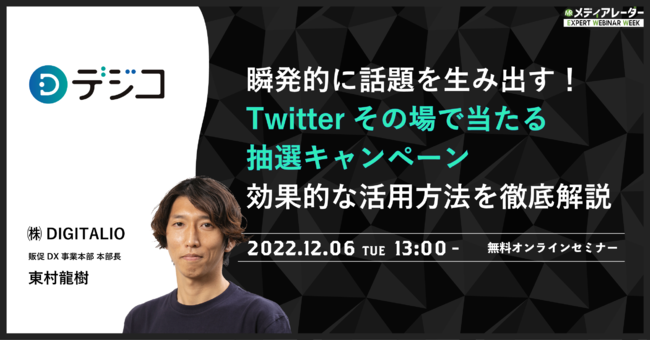 株式会社CARTA HOLDINGSのグループ会社で、マーケティングソリューション事業を展開する株式会社DIGITALIO (東京都渋谷区、代表取締役:古谷 和幸)が運営するデジタルギフト「デジコ」( https://digi-co.net/ )は、2022年12月6日(火)に開催されるメディアレーダー運営事務局主催のマーケティングセミナーイベント「第8回 メディアレーダー EXPERT WEBINAR WEEK 2022冬」で、「瞬発的に話題を生み出す!Twitterその場で当たる抽選キャンペーン 効果的な活用方法を徹底解説」をテーマとしたセミナーに登壇いたします。