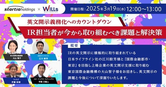 投資家と上場企業を結ぶIR支援カンパニーである株式会社ウィルズ(本社:東京都港区、代表取締役社長:杉本 光生)とスターティアホールディングス株式会社(本社:東京都新宿区、代表取締役社長:本郷 秀之)は2025年3月 19日 (水)に『英文開示義務化へのカウントダウン:IR担当者が今から取り組むべき課題と解決策』共催ウェビナーを実施いたします。