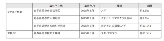 タケエイ林業及び津軽BEは、新たに山林(合計約103.2ha)を取得いたしました。これにより、現在TREグループ全体で保有する社有林は約927haとなっております。