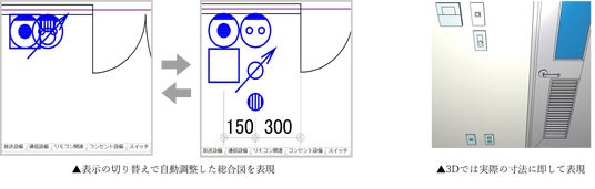壁付電気部材のシンボル表示が重なった箇所を総合図用に自動調整でき、さらにシンボ