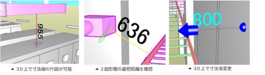3Dモデル上で、直感的に寸法線が作図でき、搬入経路、配管や機器取付のスペース確認