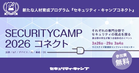 次代を担う日本発で世界に通用する若年層の情報セキュリティ人材を発掘・育成することを目指す一般社団法人セキュリティ・キャンプ協議会と独立行政法人情報処理推進機構(IPA)は、新たな人材層の育成を目指す新プログラム「セキュリティ・キャンプコネクト」を本格始動し、2026年3月26日(木)~29日(日)の4日間、千葉県浦安市にて開催することを決定しました。これに伴い、2025年12月3日(水)より参加者募集を開始します。