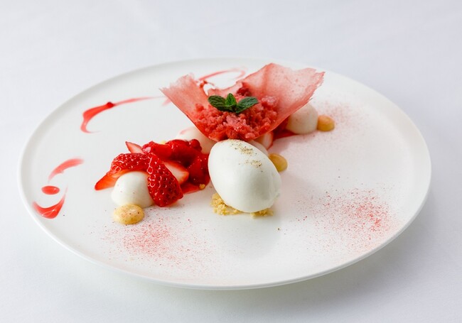 香り高く、瑞々しい「みつのか」そのものを楽しめるよう、カットした「みつのか」をたっぷりと盛りつけ、さらに「みつのか」のグラニテを添えました。いちごとも相性のよいレアチーズのムースとショコラブランのジェラートで、甘みと酸味のアクセントをプラス。鮮やかな完熟いちごの色合いと春らしい爽やかな味わいが楽しめます。