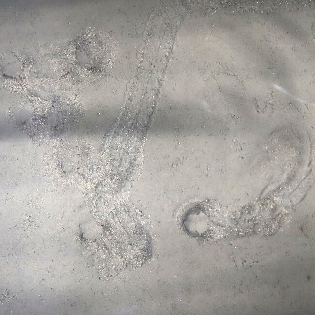 1. 干潟を再現した水槽で過ごす様子を展示します。泥の中に潜って姿を見せない事も多いですが、泥の上に残った「尾を引きずって歩いた跡」や、「潜った跡」を探して観察してみてください。