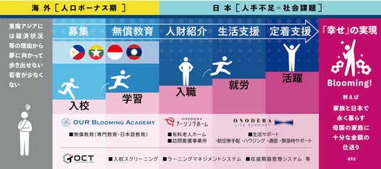 OURでは、アジア4カ国で展開する無償教育拠点「OUR BLOOMING ACADEMY」にて、特定技能介護人材の日本語の教育を2019年から行っており、その後コロナ禍を経て、自社で育成した人材が2022年3月頃から本格的に日本での就労をスタートしました。