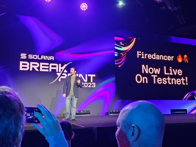 去年の Breakpoint 2022 で発表された Solana の新しいバリデータークライアントである Firedancer が、本イベントにてテストネットにおいて稼働中であることが発表されました。