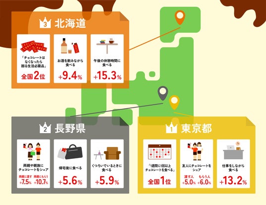 調査の結果、チョコレート愛好度ランキング第1位は東京都、第2位は長野県、第3位は北海道という結果となりました。それぞれの都道府県ごとに、チョコレートの楽しみ方には地域ごとの違いや特徴が見られました。