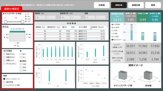 建築仕様は、メインファサード方向、ガラス種別、庇の有無、躯体の仕様を設定できます。躯体の仕様は、当社開発技術の低炭素型のコンクリート「クリーンクリート(R)」やハイブリッド木造といった低炭素型資材の設定も可能です。