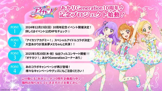 2024年10月2日で、アニメ『アイカツ!』のあかりGenerationが10周年!10周年を記念したイベント「あかりGeneration 10周年記念イベント『キラッキラ!』」を2024年12月15日(日)に横浜BUNTAIにて開催決定!さらに『アイカツアカデミー!』に「大空あかり」が登場するなど、様々な記念プロジェクトも!