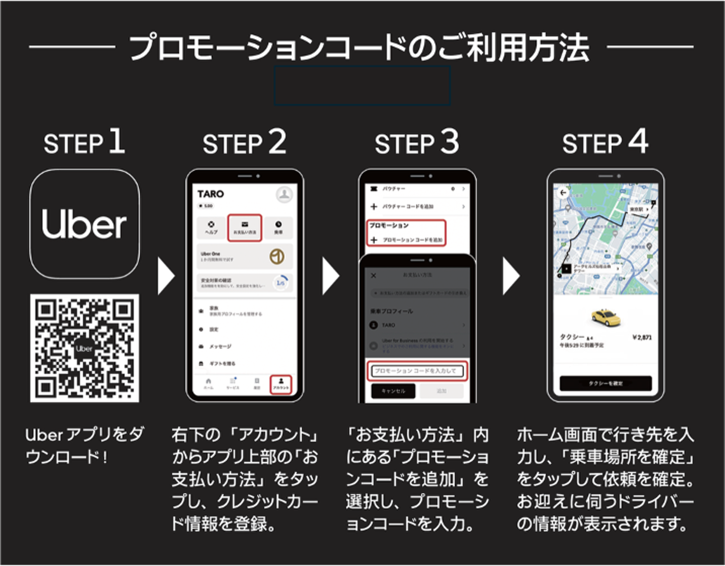 【HNDLPU25】を入力いただくと、最大 1,000 円 OFFで Uber Taxiにご乗車いただけます。
