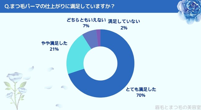 まつ毛パーマの仕上がりに満足したかお聞きしたところ「とても満足した(70%)」、「やや満足した(21%)」、「どちらともいえない(7%)」、「満足していない(2%)」という結果になりました。