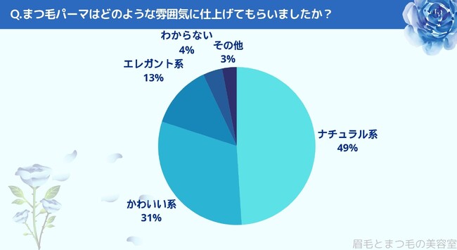 まつ毛パーマはどのような雰囲気に仕上げてもらったかお聞きしたところ「ナチュラル系(49%)」、「かわいい系(31%)」、「エレガント系(13%)」、「わからない(4%)」、「その他(3%)」という結果になりました。