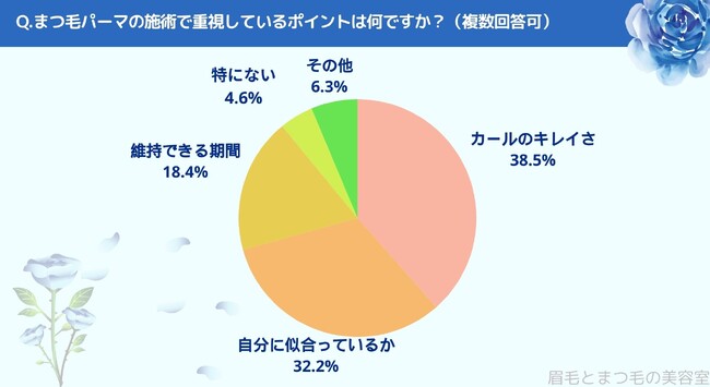 まつ毛パーマの施術で重視しているポイントは何かお聞きしたところ「カールのキレイさ(38.5%)」、「自分に似合っているか(32.2%)」、「維持できる期間(18.4%)」、「特にない(4.6%)」、「その他(6.8%)」という結果になりました。