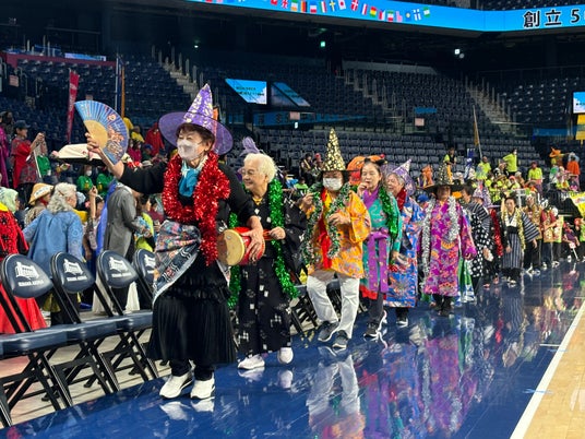 会場となった沖縄アリーナでは、琉球ゴールデンキングスのホームゲームそのままに、試合と同じ環境の木床を運動会の会場とし、およそ900名の参加者が親睦を図りながら、総踊りやスプーンリレー、ハロウィーンの仮装行列、シュートチャレンジや三種目リレーなどの競技に参加しました。真剣な眼差しや、多くの笑顔が溢れ、素晴らしい運動会となりました。また、競い合いながら運動を通じて健康促進だけでなく、仲間との交流を深める貴重な機会となり、参加者同士の絆も深まった様子でした。