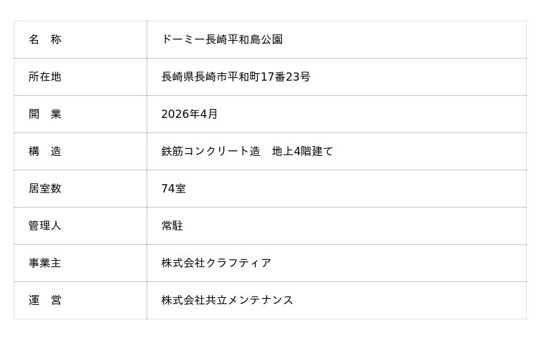 このたび、株式会社クラフティア(以下、当社グループ)は、株式会社共立メンテナンス(本社:東京都千代田区、代表取締役社長 中村幸治)と建物賃貸借契約を締結し、長崎市内に当社が有する遊休地において、学生寮・社員寮「ドーミー長崎平和公園」を2026年4月に運用開始いたします。