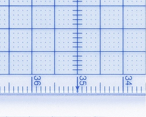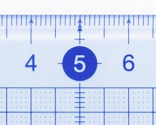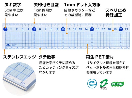 定規の端にステンレス製の金棒(ステンレスエッジ)がはめ込まれており、カッターによる削れや傷つきを防ぎます。さらに、1mmドット入りの5mm方眼、矢印付き目盛、タテ数字など、作業効率を高める機能も充実。本体が透けて下の文字や図形を確認できるため、水平・垂直方向などの細かい位置合わせもスムーズです。