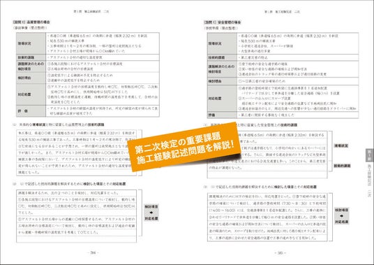 後半の第2編では、第二次検定の過去問題とその対策について指南しています。とくに、第二次検定合格に向けて最重要ポイントともいえる施工経験記述問題については、どのようなことに注意し記述すればよいか、よい記述例を具体的に示しながら詳細に解説しています。