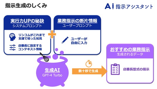 本部の方が指示の要点となる簡単なことばを入力すると、リンコムがお客様への支援で培ったノウハウ(知見)と店番長アプリ上に設定してある情報をシステムプロンプトとして組み合わせてインプットし、生成AI(OpenAI社のGPT-4 Turbo)によっておすすめの業務指示が数十秒で生成される仕組みです。