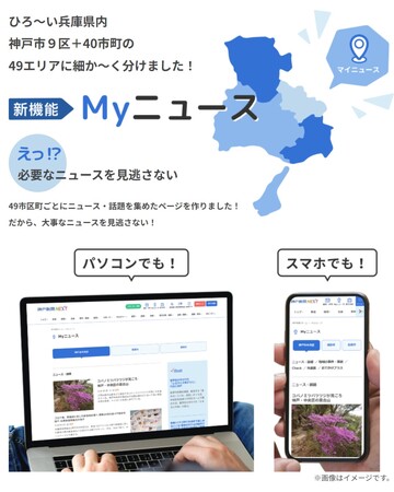 このような時代に、神戸新聞NEXTは生まれ変わります。「『地元・兵庫』のことをもっと考えたくなる、『わたしオリジナル』のニュースメディア」へ。利用する一人一人の「知りたい」にこたえられるメディアになれるよう、機能もデザインも一新します。たとえば、イチ押しの新機能「Myニュース」は、地域を登録しておけばニュースだけでなく、イベントやお店情報、安全・安心情報なども自動的に集まります。どの地域を選ぶか、その組み合わせはおよそ2万種類。「自分だけ」のニュースサイトができあがります。