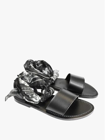 取り外し可能なスカーフストラップ付きのレザーサンダル。スカーフは、アーティスト、アドリアン・ボーが特別にデザインしたものです。