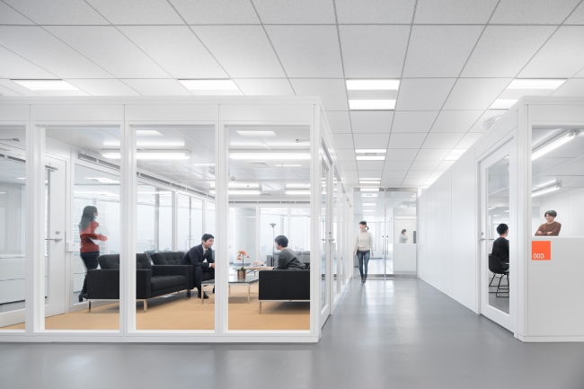 執務スペースと応接室も、未完成・発展性と、透明性のテーマが活かされた設計となっています。執務スペースについては、個人が十分にパフォーマンスを高められるようなスペースを設けつつ、コラボレーションが生まれやすいようにレイアウトされています。また、応接室については、四方ガラス張りで透明性を高めながらも、ソファやサイドテーブルなどで心地よいギャップを体現しています。
