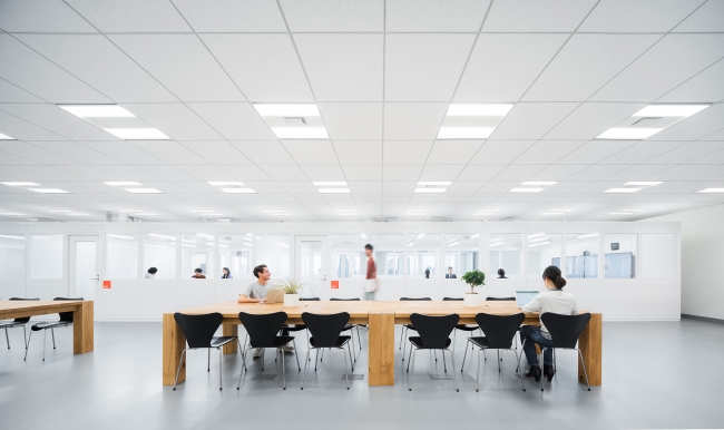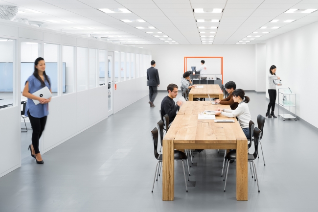 エントランス空間を抜けると、共用スペースと会議室が現れます。共用スペースには、木製のテーブルが4つ並んでおり、カジュアルにミーティングをしたり、フレキシブルに社員が好きな場所で作業をしたりすることができます。この共用スペースは、六本木移転前の表参道オフィスにあった、エンプティースペースの発展型として捉えることができます。会議室は、コマニー株式会社(代表取締役社長:塚本 幹雄)の「ファクトリーブース」を使用し、透明性が高く、拡張性の高いデザインとなっています。このファクトリーブースは、通常、工場内の事務所や休憩室、倉庫などを作るために使用しているパーテーションで、これをあえてオフィス環境に使用することにより、オフィスデザインのコンセプトである「未完成、発展性」を表現しています。