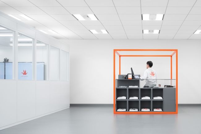 受付前にはOrigamiのロゴをかたどった大きなソファが置かれています。受付を入るとすぐ目につく位置に、Origamiのキャッシュレスを体現する「Origami Kiosk」が設置されています。Origami Kioskは、Origamiが提供する、キャッシュレスと新しいショッピング体験を象徴したユニットで、全体がコーポレートカラーであるオレンジのフレームで囲われています。Origami Kioskでは、Origamiの従来のロゴやOrigami Kioskの新たな手書き風ロゴを配した、ボールペンやマスキングテープなどのステーショナリー、Tシャツなどのウェア、傘などの小物類を販売しており、社員や訪問客は、Origami Payを利用してこれらの商品を購入可能です。また、これらのオリジナルグッズの他、社員がキャッシュレスで一日過ごせるよう、ドリンクやフードも提供します。