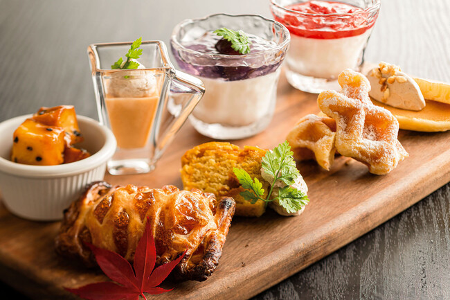 デザートでは、ぶどうプリンやマロンプリン、りんごの果実感が魅力の自家製アップルパイをご用意しました。他にも、安納芋のパウンドケーキにパンケーキ&ワッフル、チョコファウンテンなど種類豊富なデザートを取りそろえております。