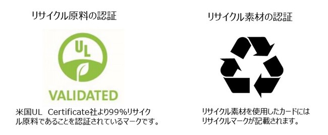 カードに使用する素材は、EU内産業廃棄物より製造された、99%リサイクル原料の硬質PVCフィルムを使ったリサイクル素材を使用します。カードの裏面には、リサイクル素材を示すリサイクルマークが入っています。
