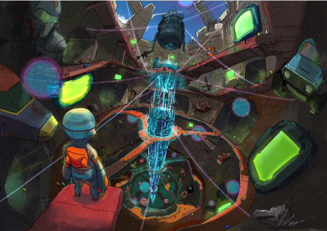今年のTGSVRは、ゲームファンの皆様にメタバース空間をワクワクしながら隅々まで楽しんでいただきたいという想いから、冒険をしながらゲームショウを巡ることができる「ダンジョン」を舞台にしました。そして今回、2022年にはシリーズ累計発行部数が120万部を突破し、アニメや映画でも大きな話題となった『映像研には手を出すな!』の作者である、漫画家の大童澄瞳先生にキービジュアルを描きおろしていただきました。大童先生の描く想像力を掻き立てるイラストレーションによって、今年の舞台である「ダンジョン」の魅力を存分に表現していただきたいという想いから、制作をお願いするに至りました。キービジュアルは実際のVR会場制作と並行しながら制作され、特にダンジョンの中心となる御柱(みはしら)と竪穴のデザインには大童先生のアイデアも取り入れられています。