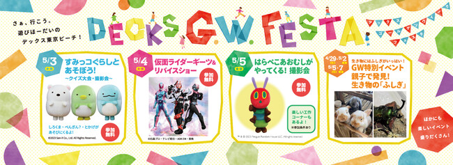 2023年5月3日(水・祝)は、「すみっコぐらし」から「しろくま」、「ぺんぎん?」、「とかげ」がデックス東京ビーチに登場し、クイズ大会や撮影会を実施します。5月4日(木・祝)には、大人気ヒーロー「仮面ライダーギーツ」と「仮面ライダーリバイス」のヒーローショーを開催。テレビや映画とは一味違った仮面ライダーギーツ&リバイスの活躍が見られます。5月5日(金・祝)は、絵本でおなじみの「はらぺこあおむし」が登場し、撮影会ほか、おなまえホルダーやビニペタ工作コーナーなど親子で楽しめる企画を展開します。