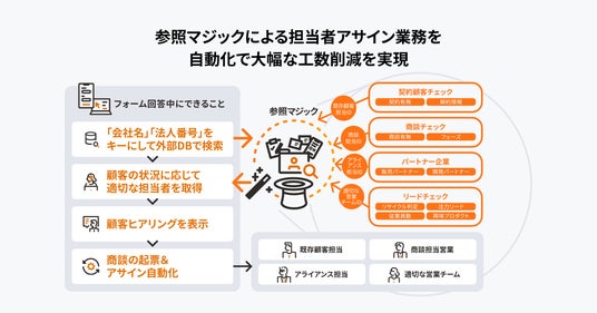 Ask Oneの参照マジックによって獲得した名刺の会社情報からSalesforceの各種オブジェクトの情報を検索し、自動的に最適な担当者情報を抽出してフォームの入力値に保持する仕組みを構築することで、従来発生していた担当者アサインの業務工数は自動化され、即時完了できるなど大幅な業務効率化を実現しました。