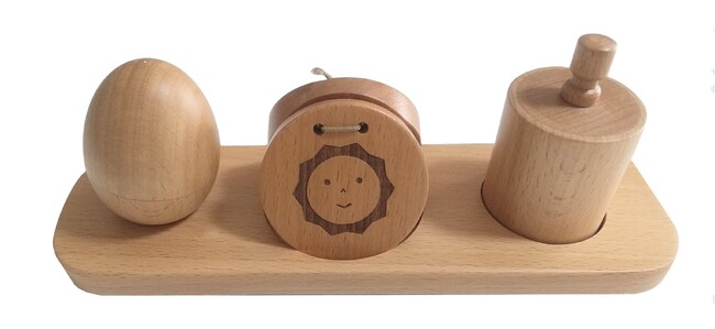 「"小さな太陽シリーズ" マラカスとカスタネット」は、0歳7か月から遊ぶことができる知育玩具です。初めての楽器遊びにぴったりなマラカス2種とカスタネットをセットにしました。マラカスは音色と形状が異なる2種類のものが含まれています。赤ちゃんにとって心地よい、優しい音が出るように設計している他、小さな赤ちゃんの手に馴染みやすいサイズ感や軽さ、温もりあふれる天然木の質感にもこだわっています。