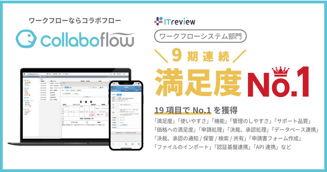 「ワークスタイルの未来を切り拓く」を理念に掲げ、クラウドサービス「コラボフロー」を提供する株式会社コラボスタイル(所在地:愛知県名古屋市、代表取締役社長 兼 CEO:松本 洋介)は、国内最大級のIT製品・SaaSレビューサイト「ITreview」が発表する 「ITreviewカテゴリーレポート 2023 Summer ワークフローシステム部門」 において、コラボフローが9期連続で顧客満足度No.1に選出されたことをお知らせします。また、前回同様、従業員数で企業規模を分けた、大企業(従業員数1,000人以上の企業)、中堅企業(従業員数100~999人の企業)、中小企業(従業員数100人未満の企業)の各部門においても満足度No.1を獲得しました。